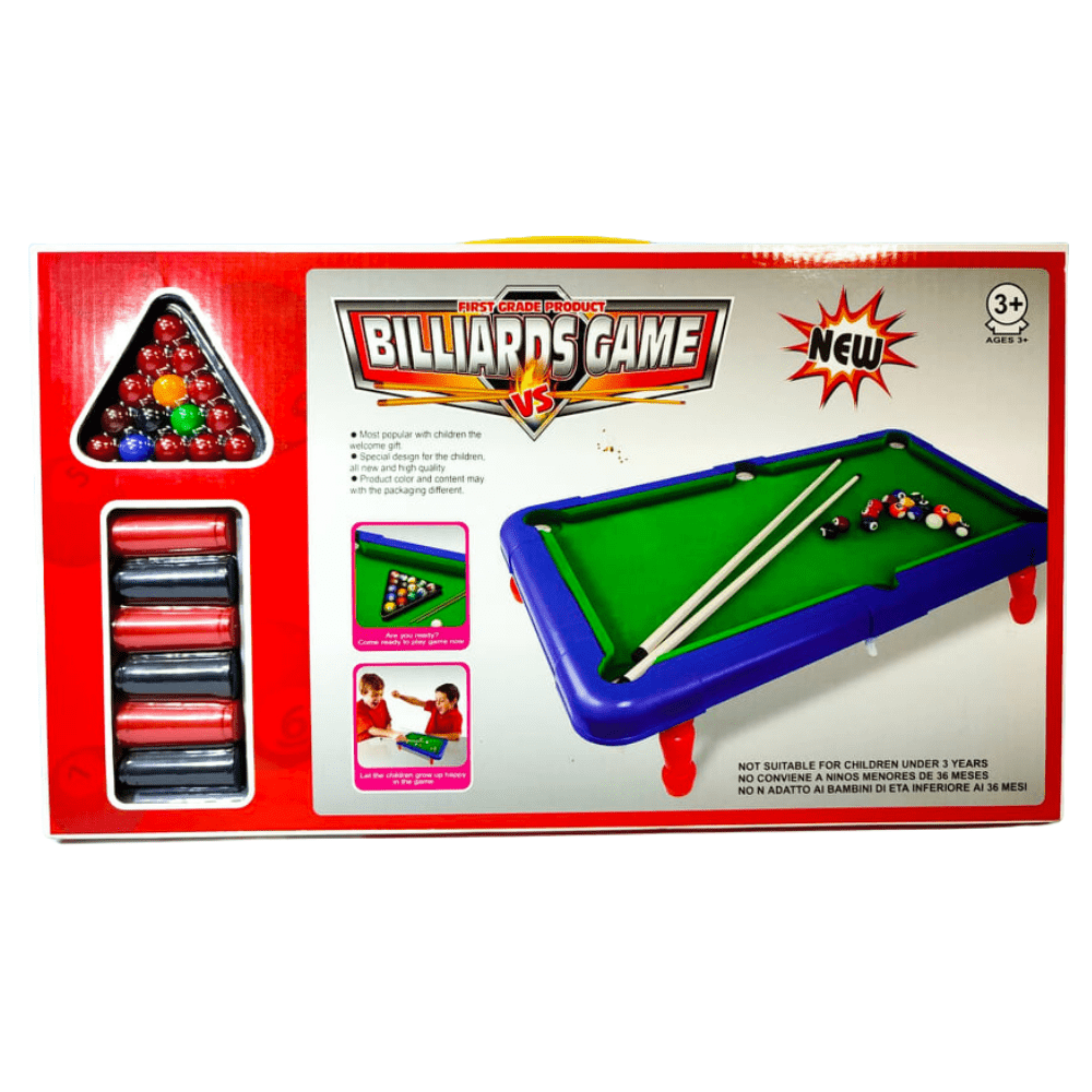 Juguete de una mesa de billar con los accesorios de las bolas de billar y lo palos de billar.
