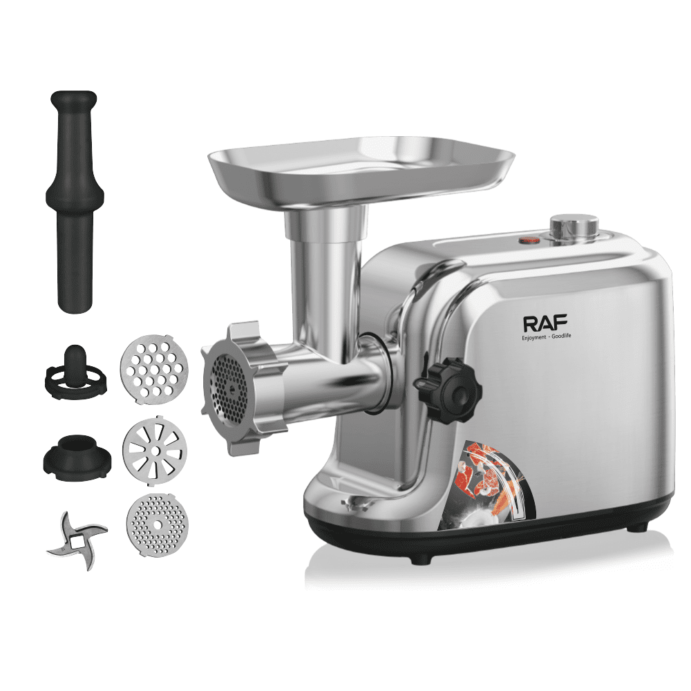 El Moledor de carne RAF R.3398 es un equipo potente y práctico para triturar y procesar carne de manera eficiente en tu cocina. Diseñado para uso doméstico, combina un motor robusto de 600W con cuchillas resistentes de acero inoxidable, permitiéndote preparar carne molida fresca para hamburguesas, albóndigas, rellenos y más.